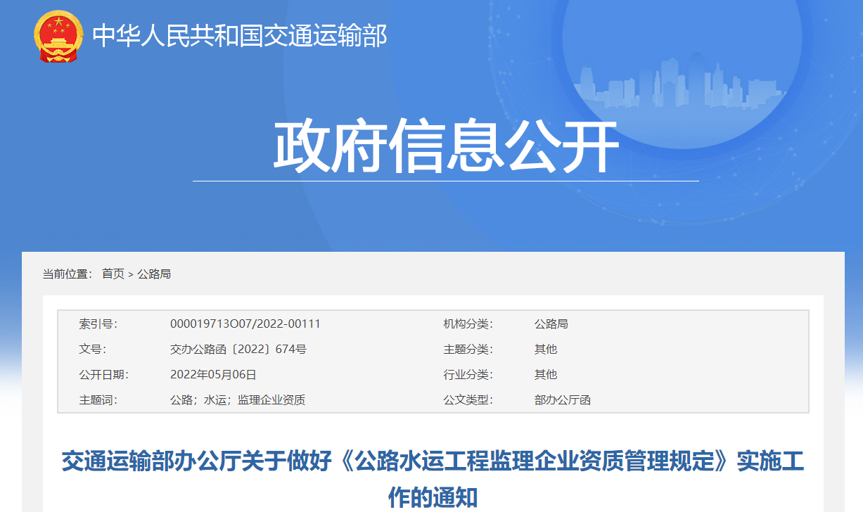 交通運輸部辦公廳關于做好《公路水運工程監理企業資質管理規定》實施工作的通知